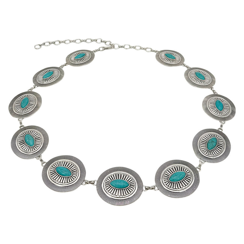 These unique concho belts adds a bold, Western-inspired touch to your outfit. For details on the history of turquoise and to view other turquoise accessories, including this item, visit our blog "Turquoise Dreams". Crafted with intricate patterned conchos and adorned with natural turquoise stones, these pieces make a striking statement accessory. The chain link design gives it a stylish, versatile look that pairs effortlessly with jeans, skirts, or dresses. The belt features a convenient lobster clasp closure, offering a secure fit and adjustability. With a 35-inch body length and an additional 10-inch extension, you can tailor it to suit your style and comfort.