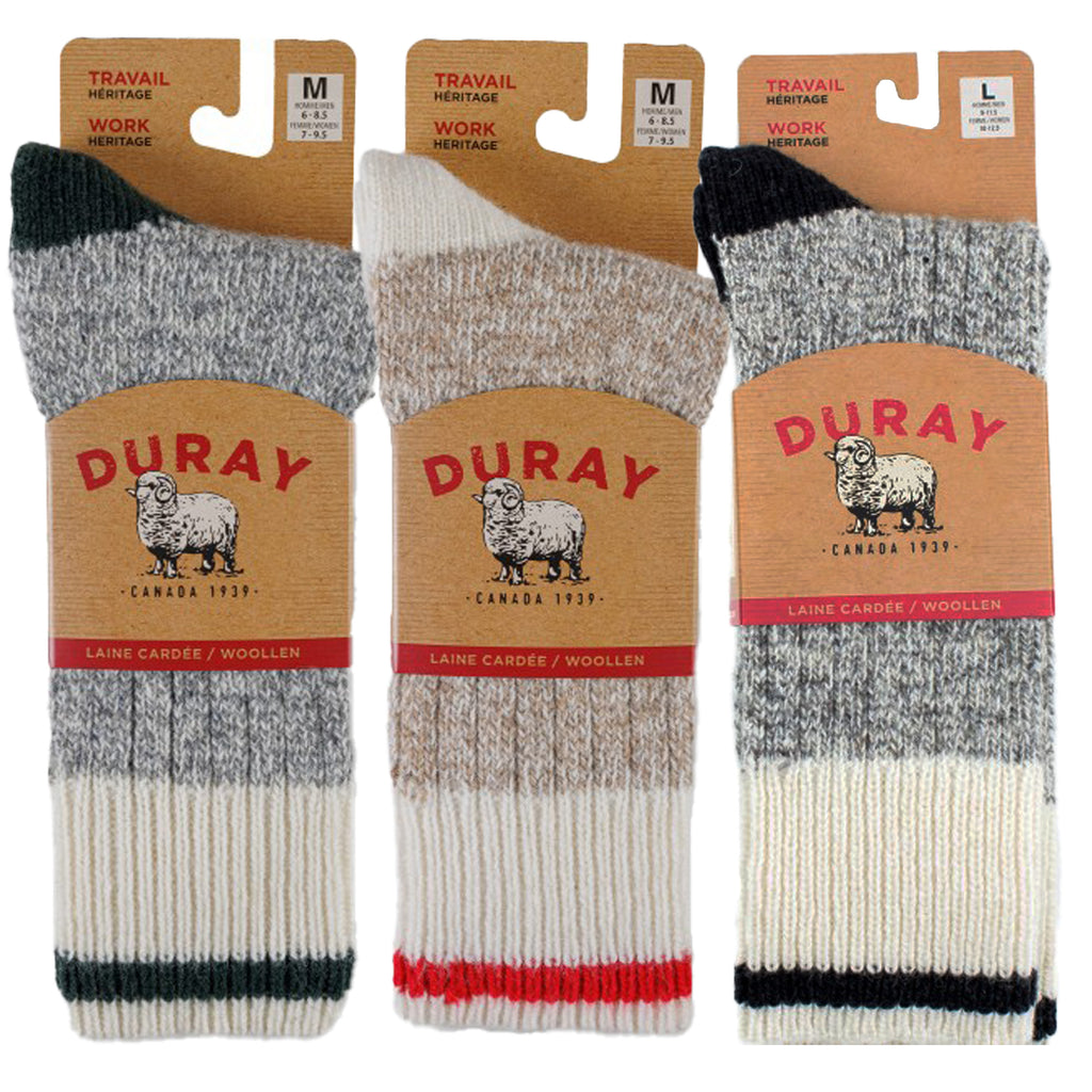These men's wool work socks are soft, stretchy, and made with a blend of Duray homespun woollen and Merino wool yarn. Canadian-made, these classic heritage crew-length wool socks are solid and durable thanks to the double-twisted yarn. They are made of 40% Wool, 34% Nylon, 20% Cotton, 5% Acrylic and 1% Spandex. Each three-pack of durable wool work socks comes with three different colours per pack. These wool socks are authentic woollen socks made entirely in Canada. This particular 3-pack of socks comes in size men's large, which is men's shoe sizes 9 - 11½.