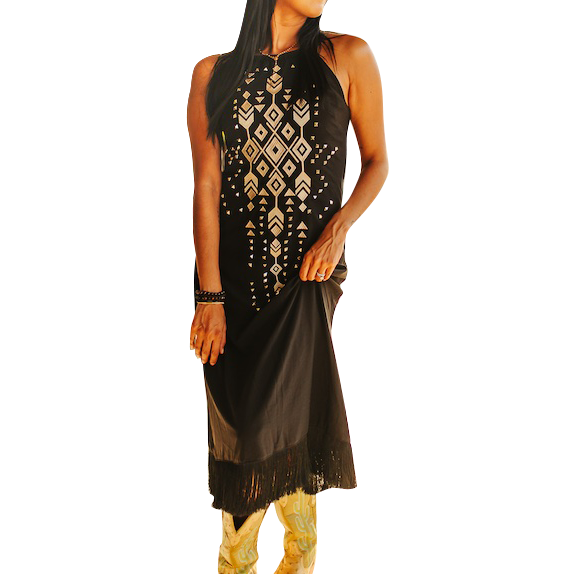 This long, fringe hem halter dress is both bold and classy. The front features a beautiful and captivating Aztec embroidery with edgy studs for added flair. Crafted with a halter neckline and finished with a fringe hem for added movement and flair, it’s perfect for dinners, concerts, or downtown strolls—the lightweight fabric drapes beautifully. At the same time, the sleek silhouette flatters a wide range of body types. The dress features an added lining and a side zipper for easy on and off. Grab yours before they're gone.