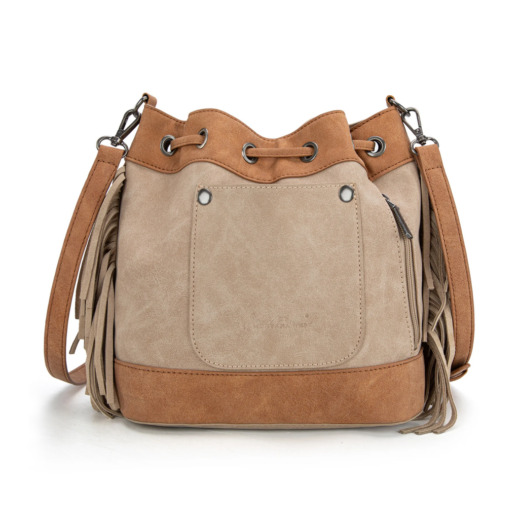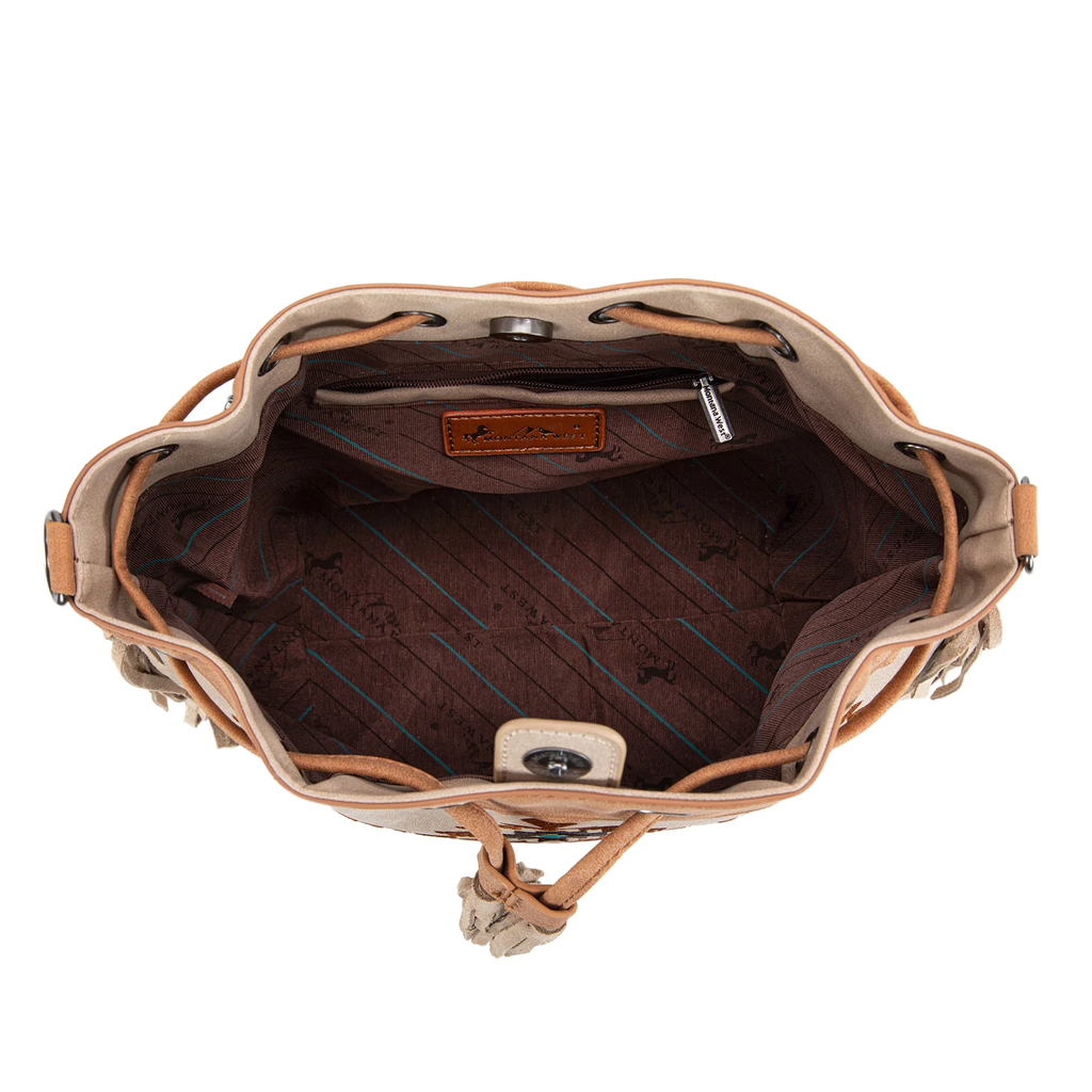 This bag speaks to your inner cowgirl and combines frontier fashion with functionality. Crafted from soft, suede-feel PU leather, this beautifully detailed bag features an embroidered Aztec pattern accented with fringe and tassel details for a timeless, boho-western look. The drawstring top is complemented by a magnetic button closure, offering both style and security, while the structured base with metal feet provides added protection and stability.