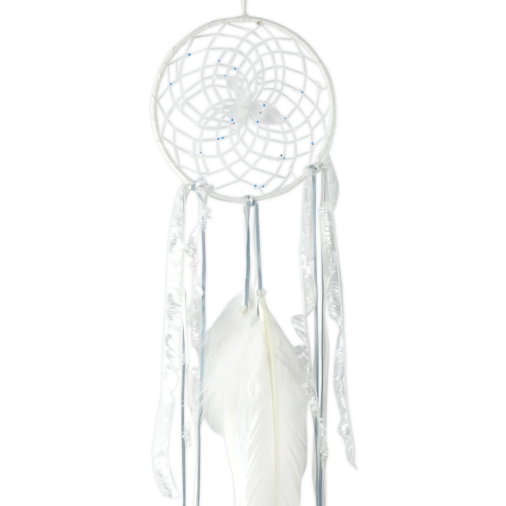 Inspired by the gentle transformation of Mother Earth. She gently reminds us that things in life change and continuously evolve. This winter dreamcatcher embodies the calm and clarity of the season: crisp air, glimmering snow, and the peaceful pause before spring's rebirth. Hung in your space, it brings the essence of a winter's hush — glistening, reflective, and quiet magic.