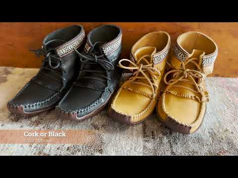 These men's ankle boots are designed specifically for Earthing in mind. They are handmade from natural materials, including genuine moose hide leather, which allows grounding to occur. They have an added leather sole in a nice dark brown leather colour, explicitly sewn for outdoor use on soft surfaces. These men's Native American-style boots come in Cork Brown colour and have a double fringe as well as an Indian braid. They are ankle height and have rawhide leather lace-ups for tightening.