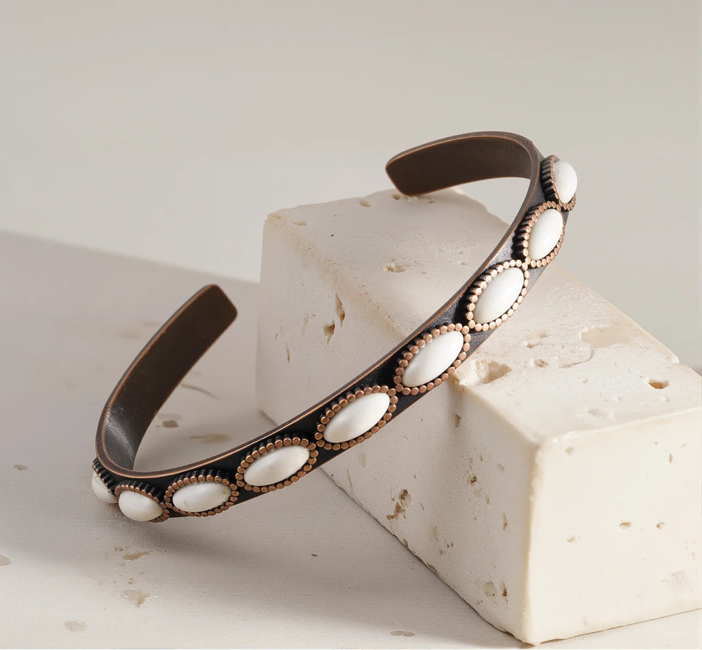 These dainty cuff bracelets are available in two gorgeous colours: antique silver with a turquoise-colored stone or antique bronze with a crisp white stone. Each cuff is crafted from copper and designed in a small, delicate size that's perfect for layering with other bracelets or for solo wear if you prefer a dainty, minimalist look. Lightweight, adjustable, and beautifully detailed, it adds just the right touch of Western-inspired charm without overpowering your look.