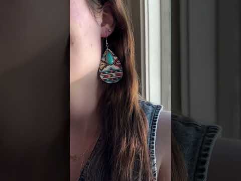 These earrings add a touch of fun and Western flair to your outfit. Each teardrop-shaped piece has an intricate geometric design on a wood backdrop inspired by Southwest artistry. At the heart of each earring is a striking turquoise stone framed with delicate silver-tone accents blending natural and artisanal elements. Lightweight yet durable, these earrings ensure comfort for everyday wear.