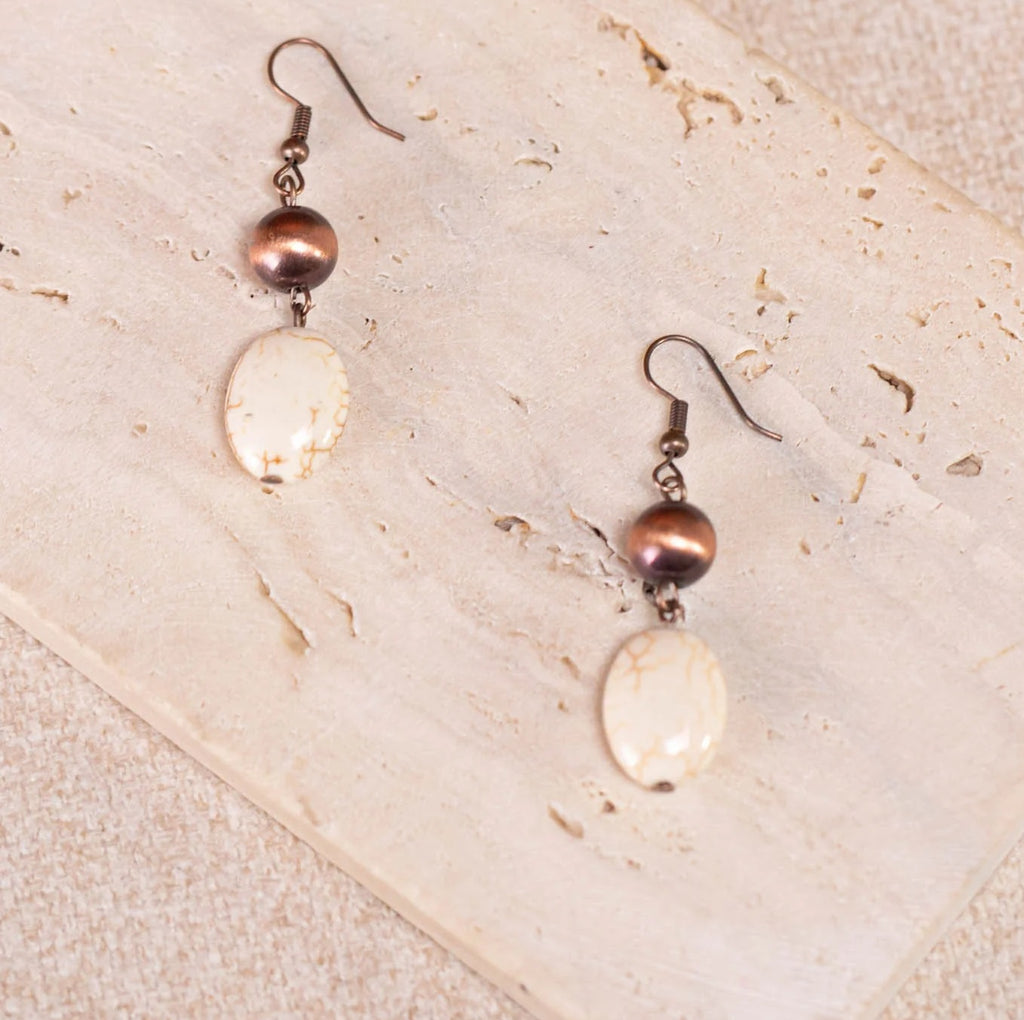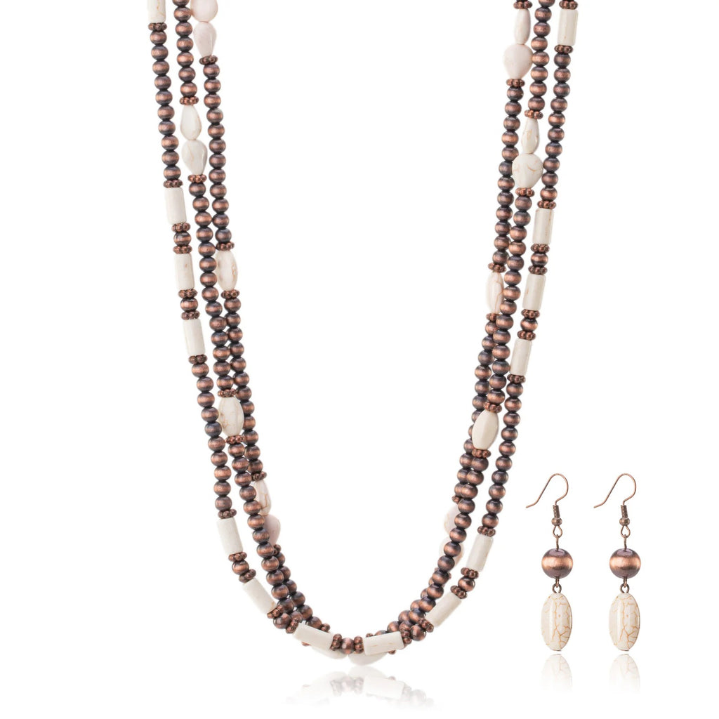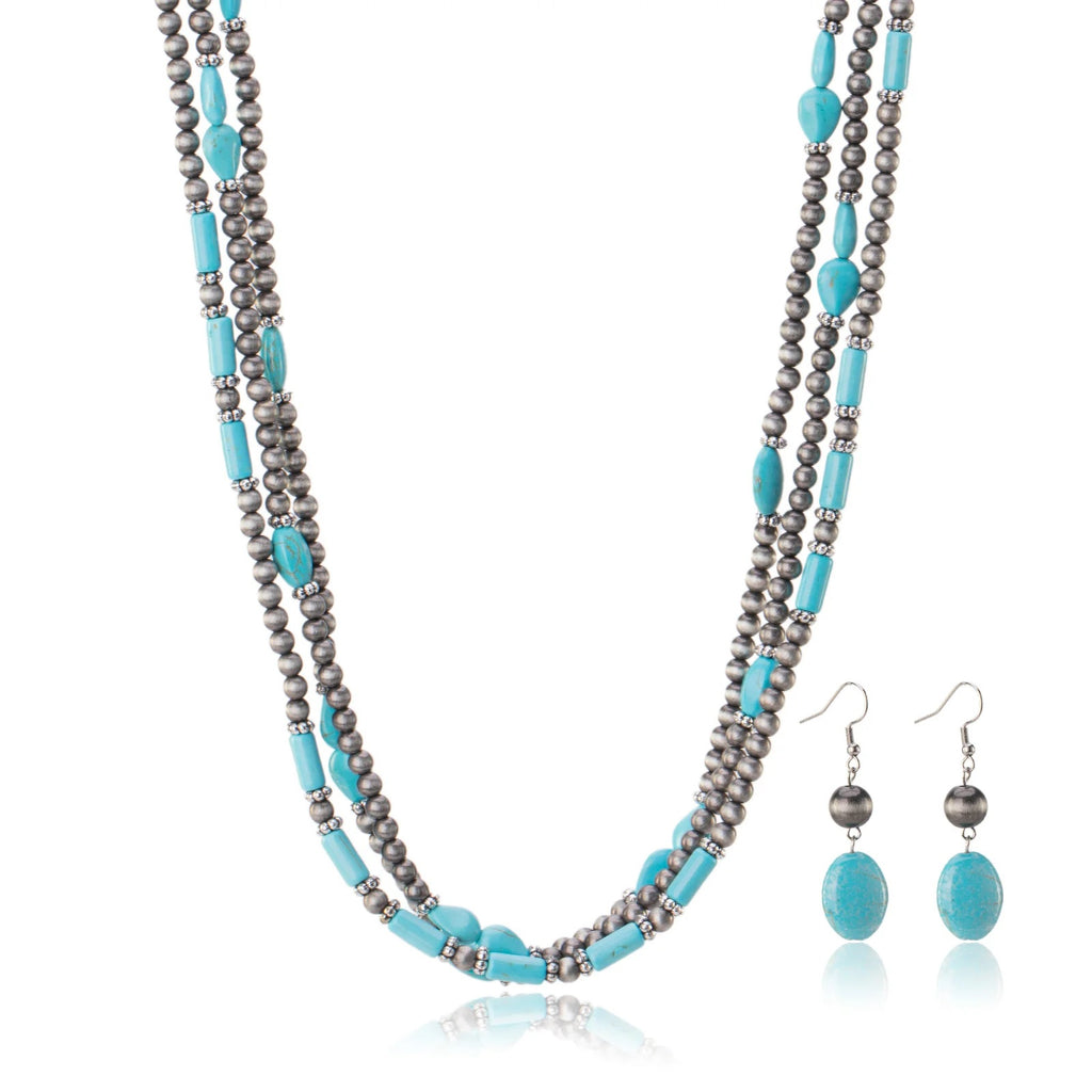 Make an instant statement with this triple-layered necklace and earring set. The set features a beautifully textured mix of turquoise and white-coloured beads strung across three separate layers that cascade from a total length of 31″, yielding an approximate 15" drop—perfect for showcasing elegance over necklines. Each strand is subtly different, with Navajo antique silver-coloured beads that create depth, movement, and a rich layered effect. The matching earrings complement the set with a touch of Southwestern flair. Whether dressed up or down, this set brings vibrant colour, artisan detail, and bold style to any outfit.