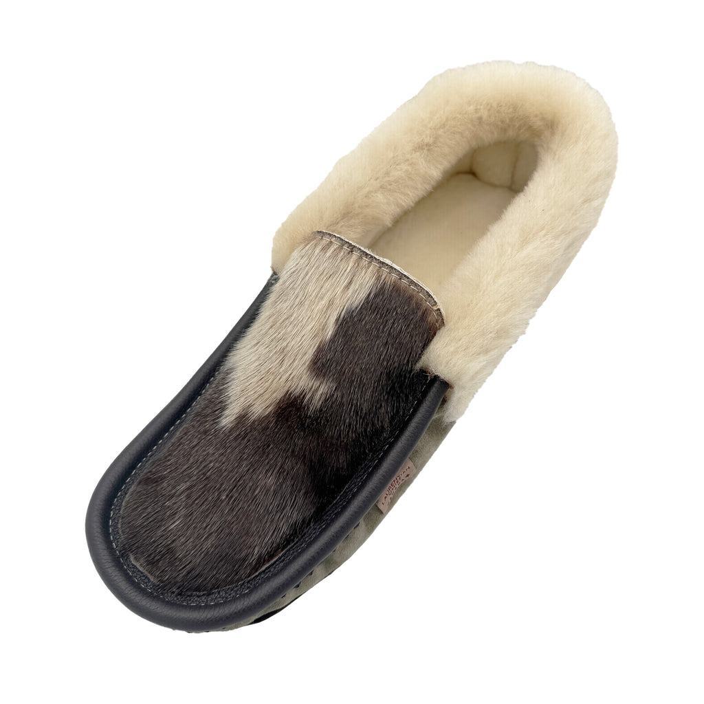 Wrap your feet in true Canadian luxury with our Sealskin Vamp Moccasins, crafted with unmatched attention to detail. Made in Canada from the finest materials, these moccasins feature a genuine sealskin vamp, plush sheepskin lining and cuff, and a soft suede leather exterior. The genuine leather sole and trim complete the design, ensuring durability without sacrificing comfort.