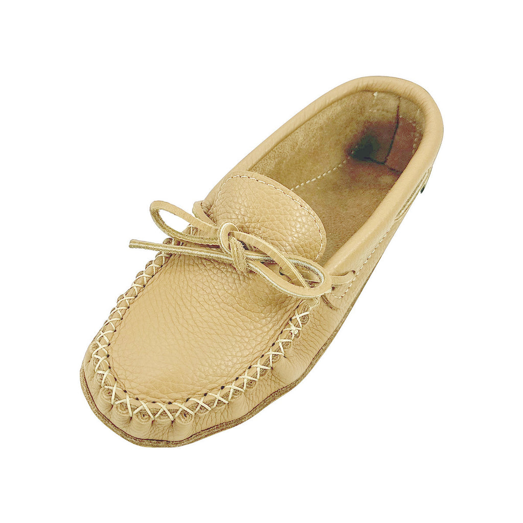 These men's moccasin slippers, made explicitly for extra wide feet, have wide footbeds, giving your feet and toes lots of wiggle room. Another great feature, is they are handmade/sewn from genuine moosehide leather which will stretch and mould to your feet giving you even more room once you break them in. These men's traditional style moccasin slippers come in an ivory colour and are perfect for indoor use as they have a durable soft sole with a foam insole between two layers of leather. The interior of these indoor moccasin house shoes is suede, which will feel great against your feet if you choose to wear them barefoot. They have rawhide laces for gentle tightening, they are easy to slip on and off, and the vamp is double-hand-stitched. Not only do they come with a wide footbed, but they also come in extra large sizes from men's size 7 to 16. These men's moccasin slippers fit true to size. For half sizes, go up to the next full size (9 ½ order size 10).
