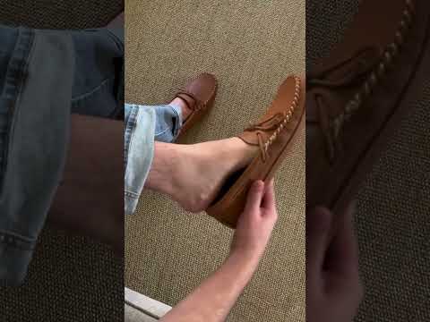 "Fitting In", featuring these wide moccasin slippers. Another great feature is that they are handmade/sewn from genuine leather, which will stretch and mould to your feet, giving you even more room once you break them in. These men's traditional-style moccasin slippers come in Chestnut Brown and are perfect for indoor use, featuring a durable, soft sole with a foam insole between two layers of leather. The interior of these indoor moccasin house shoes is suede, which will feel great against your feet if you choose to wear them barefoot. They have rawhide laces for tightening, are easy to slip on and off, and have a double-hand-stitched vamp. Not only do they feature a wide footbed, but they also come in extra-large sizes from men's size 6 to 16. These men's moccasin slippers fit true to size. For half sizes, go up to the next full size (9 ½ order size 10).