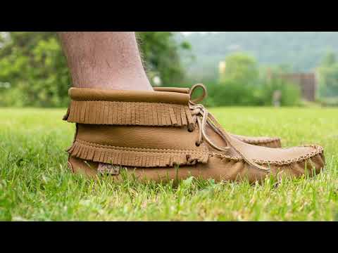 These men's moccasin boots are extremely comfortable and very stylish. They feature a double fringe and come in a Cork Brown colour. We posted this blog featuring these apache boots "Step Out of the Ordinary" check it out! They are handmade from soft and durable genuine moose hide leather. These ankle-high boots are 4" tall and look great any casual outfit. The vamp is hand-stitched and these Apache Native American style moccasin boots have raw hide leather laces for tightening. They have a outdoor crepe rubber sole. We recommend you treat these men's fringed ankle moccasin boots with a leather protector.