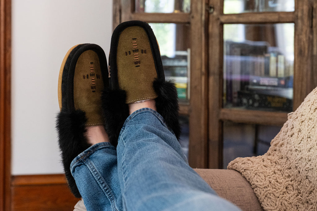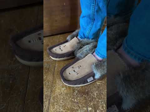 "New Season, New Style". These slippers are crafted with quality and luxurious materials, including the rabbit fur, genuine suede exterior and the warm fleece lining throughout. Not only are they great as indoor slippers, but the hard-rubber outsole also allows you the ability to step outdoors, whether you need to grab the mail or make a quick errand. We carry men's sizes 7-13 in either a black/army green combo or fudge/moka combo. These slippers fit true to size. For half sizes, we recommend sizing up to the nearest full size (10½ or size 11). These men's moccasin slippers are your next winter essential. Get them while supplies last!