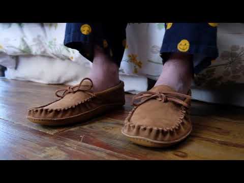 These moccasins are very easy to slip on and off and come in men's size 8-13. Size 14 & 15 available in Dark Tan. These men's moccasin slippers fit the same as your regular shoe size. If you wear a half size, go up to the nearest full size. (10 ½ order size 11)