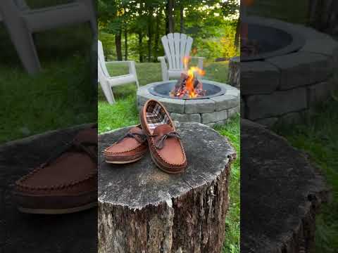 "Staycation Mode" to find out what makes these moccasins so special, along with additional product photos. Handmade in Canada from genuine cowhide, they feature a stylish two-tone design—wood-stained leather uppers paired with rich chocolate brown suede accents—for a distinctive, boat shoe-inspired look. Built for both style and comfort, they include a double hand-stitched vamp and functional laces for a customizable fit. The durable outdoor rubber sole makes them ideal for casual wear, as they are easy to slip on and off. Inside, a memory foam insole lined with a soft tartan wool blend provides cloud-like comfort. Inspired by Native American design, these moccasins are both flexible and durable. The high-quality leather moulds to your feet over time, enhancing the fit with each wear. Available in men's sizes 8–13. They fit true to size. If you wear a half size, order the next full size up (10½ order size 11).