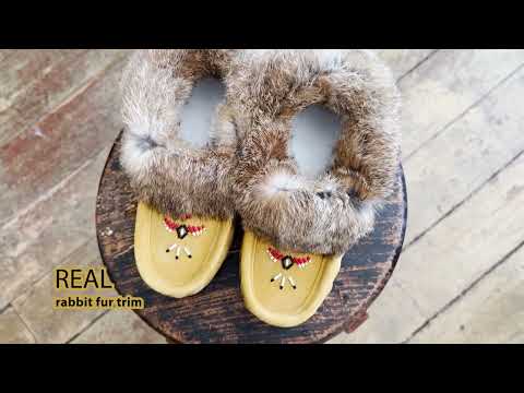 These rabbit fur moccasin slippers are easy to slip on and off, and we carry extra small and extra large sizes including ladies sizes 4-12. These ladies' moccasins fit the same as your regular shoe size, for half sizes order down to the nearest full size. (8 ½ or size 8).