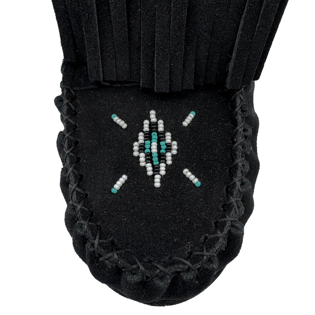 These Native-style women's Inca moccasin ankle boots are a new twist on an old favourite now available in black. These handmade moccasin boots are made from genuine suede leather in Black . They feature a stylish fold-over fringe all the way around and an added fringed front flap that you can wear up or down. Beneath the flap are lace-ups in case you need to tighten these Native American-style moccasin boots. These women's moccasin boots feature a hand-sewn Native Indian beaded design on the vamp. They are durable, and the vamp is double-stitched. They are for outdoor usage as they feature a durable black rubber sole and a comfortable padded insole. They reach just above the ankle - 6" tall from the ground up.